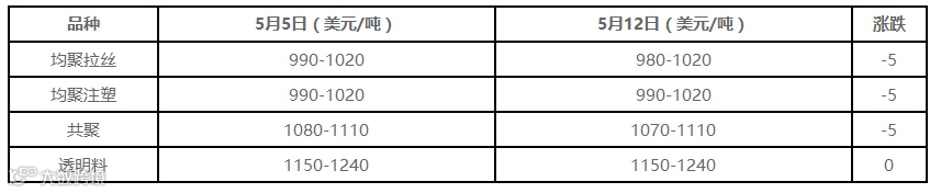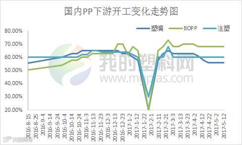 截止5月12日当周,国内聚丙烯下游行业开工率变化不大。其中塑编行业开工率在56%左右,共聚行业开工率在60%,BOPP行业开工率在68%左右。本周原料价格较上周继续走低,下游制品价格继续下行。生产企业新增订单变化不明显。市场询盘一般,下游工厂延续随用随拿的方式。