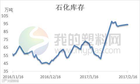 春节假期过后石化塑料库存累积至93万吨,由于价格偏高,同时终端开工较晚,石化库存消化缓慢,库存持续处于90万吨以上,终端工厂及中间商观望居多,实际补库量少。月中旬,期货暴跌,持续下行,石化价格连连下调,代理商开单积极性减弱,中间商及工厂观望情绪更浓,石化塑料消化减缓,据我的塑料网统计,20日早间石化塑料库存累积至104万吨,创下年后最高库存,且国内开工比较稳定,市场供应充裕,并无计划外检修或者停车,对市场影响微乎其微。国产供应方来看,目前下游需求跟进迟缓,市场消化有限,石化库存累积较快,市场纷纷出现胀库现象。进口供应方面2016年12月份及1月份港口进口货源增多,受春节因素影响,多数船期推迟至年后。无论是石化塑料总库存还是港口库存都创下年内新高,在期货弱势下,港口及石化库存也对当前市场所谓雪上加霜。库存毕竟需要时间消化,去库存也是当前的任务,对现货市场走势起到拖累作用。