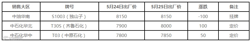 表5 5月25日国内PP出厂价格调整(单位:元/吨)
