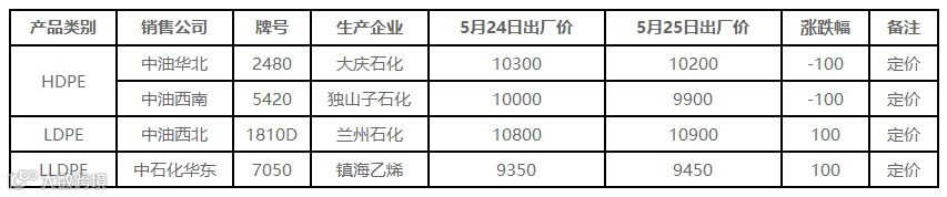 表4 5月25日国内PE出厂价格调整(单位:元/吨)