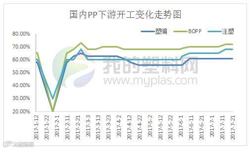 截止7月21日当周,国内聚丙烯下游行业开工率变化不大。其中塑编行业开工率在61%左右,共聚行业开工率在68%,BOPP行业开工率在71%左右。本周原料价格持续上行,下游制品价格顺势跟涨,产成品维持较好的利润。生产企业新增订单一般,工厂生产积极性有限,采购多以低价货源为主;雄县因雄安地区后期建设,工厂陆续关闭,该地区需求基本消失。