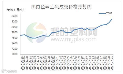 根据我的塑料网真实成交数据显示,本周国内PP市场报盘上涨。截止本周五拉丝主流价格在8100-8500元/吨不等,较上周走高300-450元/吨左右;低融共聚价格在8450-9100元/吨不等,报价较上周走高250-350元/吨不等。