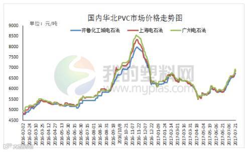 本周国内PVC市场后期成交良好。周初市场观望氛围浓厚,成交一般,随着周三V1709期货大涨带动下,场内炒涨氛围明显,成交氛围转好。截至本周末,华北地区山东信发SG-5厂提6650元/吨,较上周五涨170元/吨;大沽800厂提价格在6950元/吨,较上周五涨170元/吨;杭州榆社SG-5送到6900元/吨,较上周五涨50元/吨;广州盐湖SG-5库提6840元/吨,较上周五涨240元/吨。