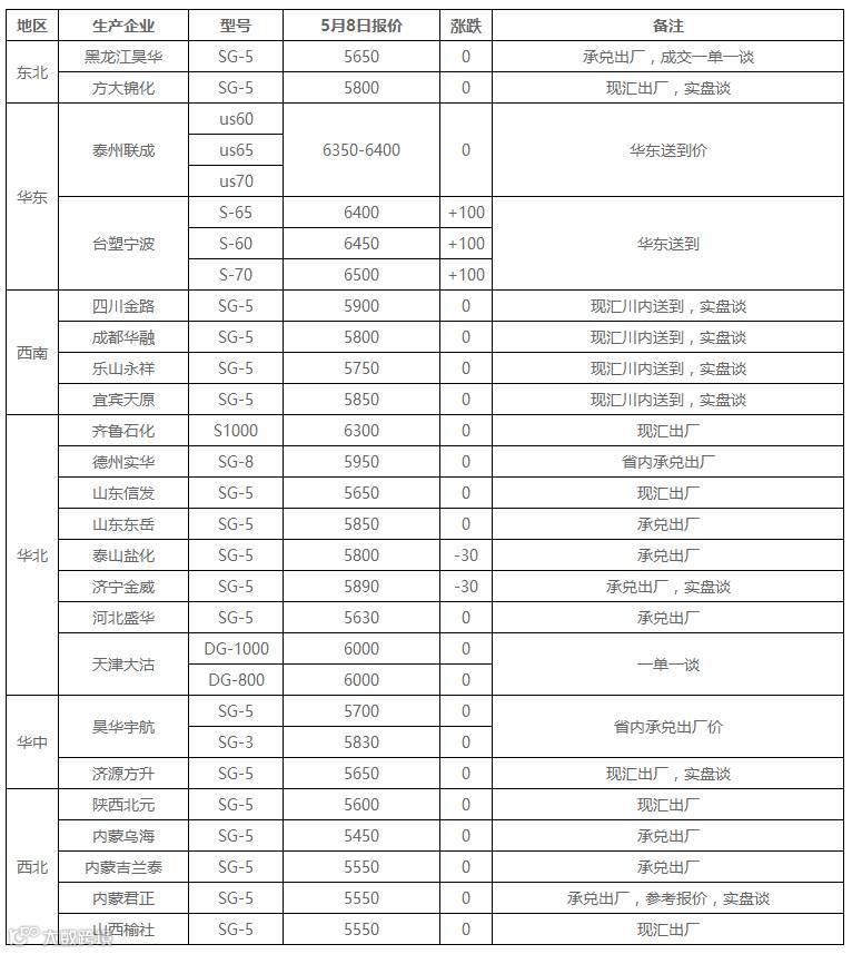 表6 5月8日国内PVC出厂价格调整(单位:元/吨)