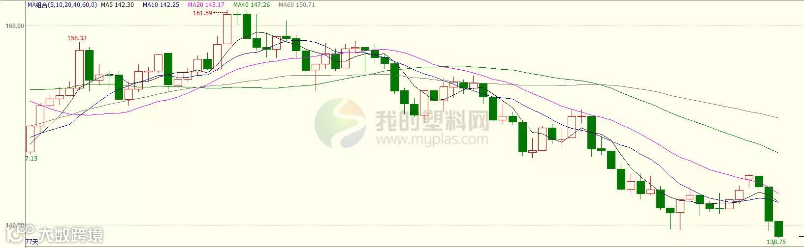 本周国内化工板块反弹受阻,全线下跌。周初开盘在130.88,周五收盘在123.72,较上周跌7.22或5.49%。最高131.86,最低123.55,持仓量增加至537.4994万手。