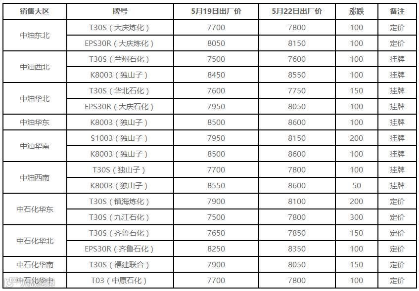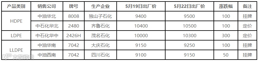 表4 5月22日国内PE出厂价格调整(单位:元/吨)