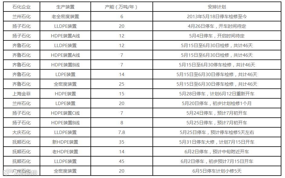 国内PE装置停车或检修情况统计