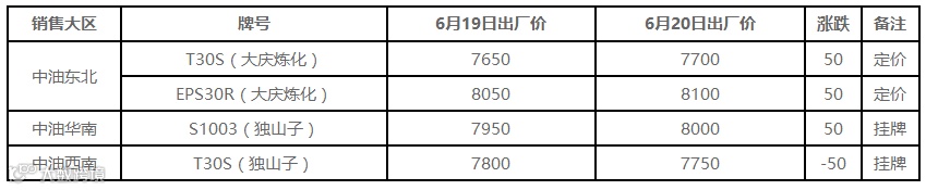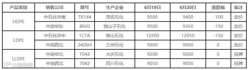6月20日国内PE出厂价格调整(单位:元/吨)