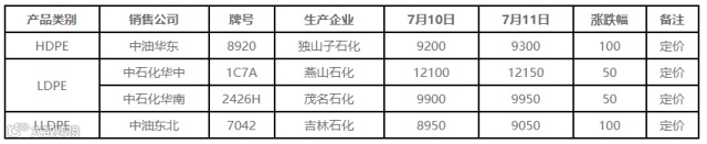 7月11日国内PE出厂价格调整(单位:元/吨)