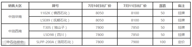 7月11日国内PP出厂价格调整(单位:元/吨)