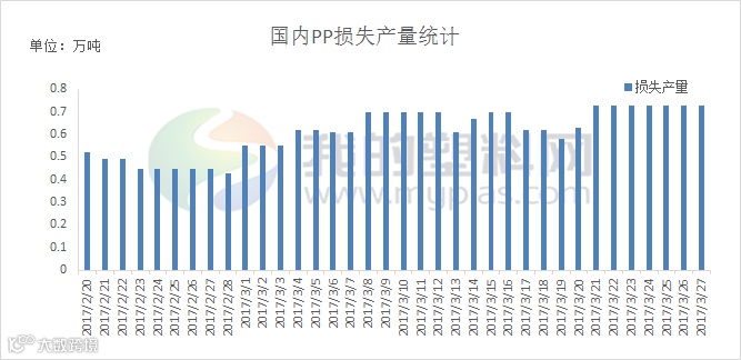 上周国内PP石化企业检修装置增多,周内新增延安炼厂、大连有机、大庆炼化装置停车检修,市场整体货源供应量略有减少。据我的塑料网统计,上周国内PP市场损失产能约在5.01万吨,较前一周4.54万吨增加0.47万吨。据市场消息,大唐多伦4月3日双线开车,但具体启动时间仍有待跟踪。而本周大庆炼化有望在28日重启,我的塑料网预计本周国内PP市场货源供应量将会较上周略有增多。