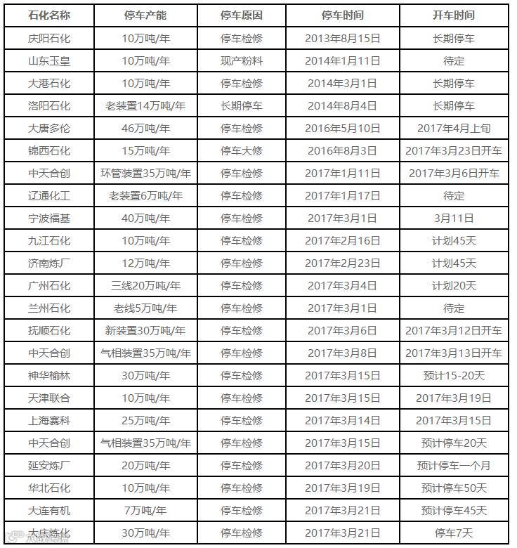 国内PP装置停车或检修情况统计
