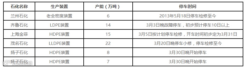 国内PE装置停车或检修情况统计
