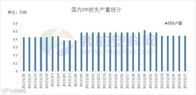 本周国内PP市场装置多稳定运行为主,周内新增济南炼厂停车检修,宁波富德恢复开车,市场整体货源供应量稳中略增。我的塑料网统计,上周国内PP市场损失产能约在3.3万吨,较上周在3.43万吨减少0.13万吨。本周国内PP石化企业暂无停车计划,我的塑料网预计本周国内PP市场货源供应量变动不大。