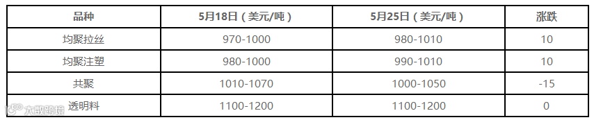 本周美金PP市场走势分化,均聚货少坚挺有涨,共聚价格小幅走低。截止本周五美金拉丝主流价格在980-1010元/吨不等。
