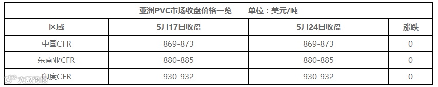 本周亚洲PVC市场延续平稳,成交尚可,价格稳定,CFR中国维持在869-873美元/吨,CFR东南亚维持在880-885美元/吨,CFR印度维持在930-932美元/吨。