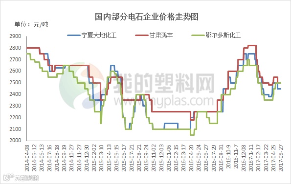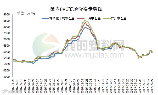 本周国内PVC市场大涨后回调。电石法5型料上涨幅度在50-150元/吨,乙烯料价格变动不大。周初,受期货连涨带动PVC企业上调出厂价格,现货市场炒涨氛围凸显,加之部分企业检修导致的货源偏紧因素被持续放大,商家报价上涨明显。随着市场价格的走高,下游企业对高价抵触,市场高位成交阻力明显。周三开始,V1709期货大幅下挫,最大跌幅达3.8%,现货市场观望氛围再起,商家对后市操作偏谨慎,部分让利出货为主,报盘松动。截止到本周末国内电石法5型料主流报价在5850-6000元/吨;乙烯料主流市场价格在6150-6450元/吨,高型号价格高150元/吨。