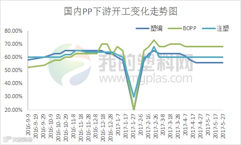 截止5月27日当周,国内聚丙烯下游行业开工率变化不大。其中塑编行业开工率在56%左右,共聚行业开工率在60%,BOPP行业开工率在68%左右。