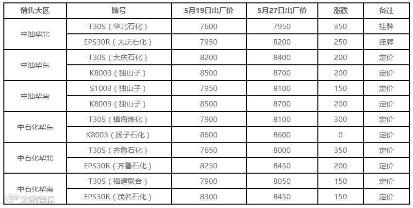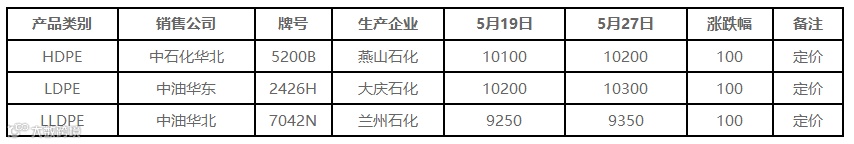 表1 本周国内PE出厂价格调整(单位:元/吨)
