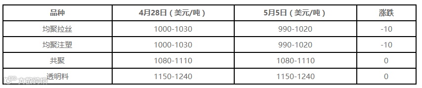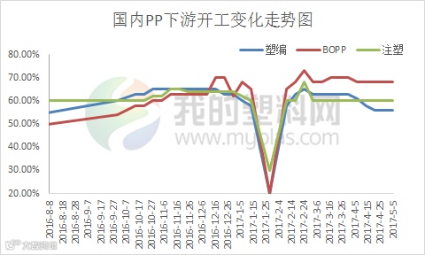 截止5月5日当周,国内聚丙烯下游行业开工率变化不大。其中塑编行业开工率在65%左右,共聚行业开工率在60%,BOPP行业开工率在68%左右。原油价格继续走低,生产企业利润有所增加。然终端新增订单情况欠佳,前期部分检修装置复工,工厂主动接货意愿不高。