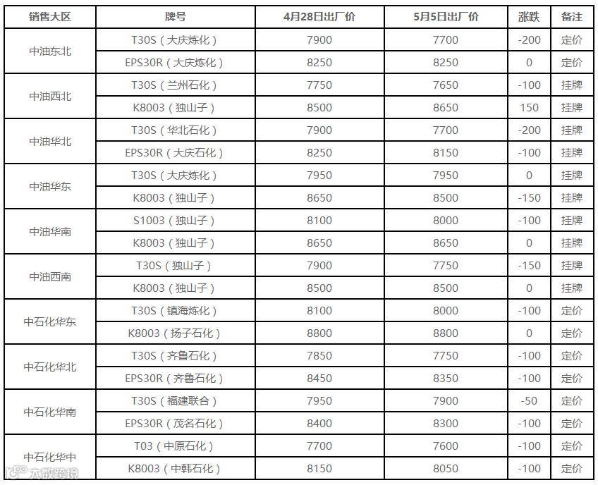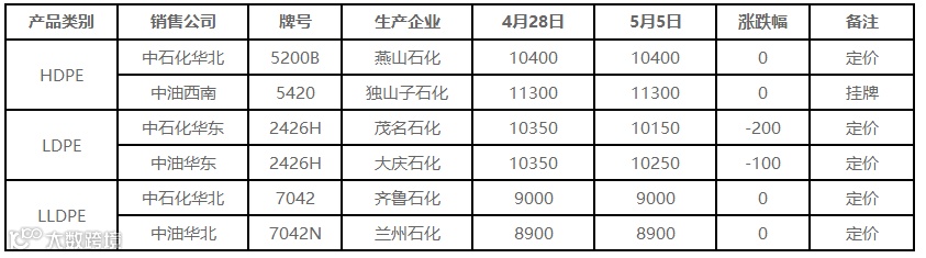 表1 本周国内PE出厂价格调整(单位:元/吨)