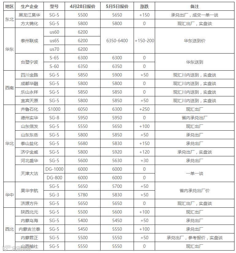 本周国内PVC市场报价上涨。前期市场价格继续推涨,市场报盘高位,商家出货良好。随着价格的走高,市场交投逐步恢复平淡,加之周四PVC期货大跌,现货市场看空明显,市场交投受阻。截至本周末,华北地区山东信发SG-5厂提5570元/吨,较上周五涨190元/吨;齐鲁S1000库提6600元/吨,较上周五涨520元/吨(因齐鲁石化15日检修,市场货少,报价推涨明显);杭州周边联创SG-5送到报5940元/吨,较上周五涨60元/吨;广州天湖SG-5库提5940元/吨,较上周五涨240元/吨。