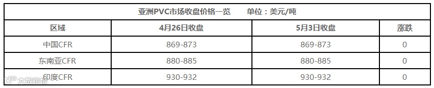 本周亚洲PVC市场平静,成交量不大,商家观望情绪浓厚,价格稳定。CFR中国维持在869-873美元/吨,CFR东南亚维持在880-885美元/吨,CFR印度维持在930-932美元/吨。市场人士多在等待6月份船货的报价。