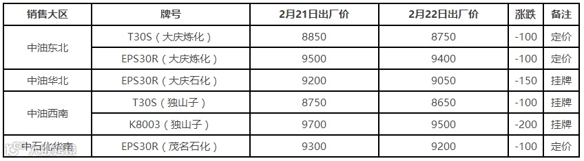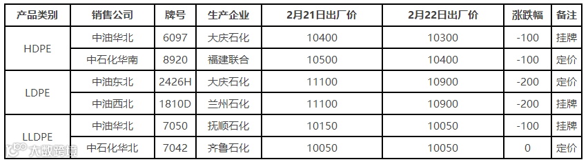 表4 2月22日国内PE出厂价格调整(单位:元/吨)