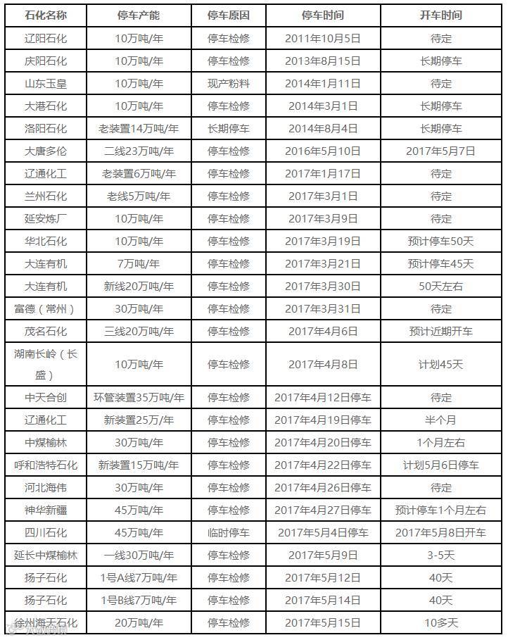 近期国内PP装置停车检修情况统计