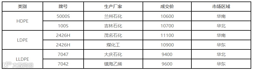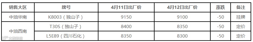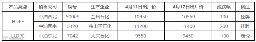 表4 4月12日国内PE出厂价格调整(单位:元/吨)