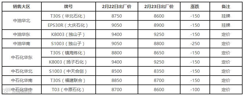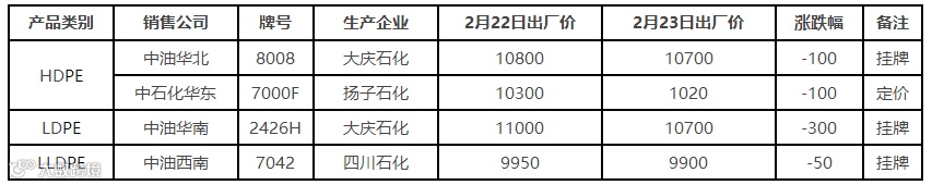 表4 2月23日国内PE出厂价格调整(单位:元/吨)