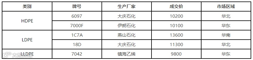 PE:今日国内PE市场延续弱势,交投偏弱。期货低开下行,现货市场观望气氛浓郁,持货商随行报盘出货为主。当前LLDPE主流市场价格在9600-9950元/吨,LDPE主流市场价格在11000-11350元/吨,HDPE膜主流市场价格在10100-10500元/吨。