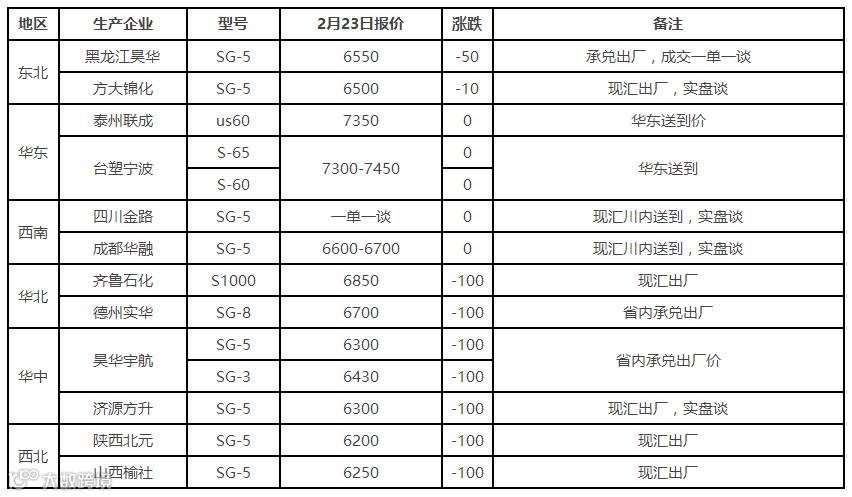 表6 2月23日国内PVC出厂价格调整(单位:元/吨)