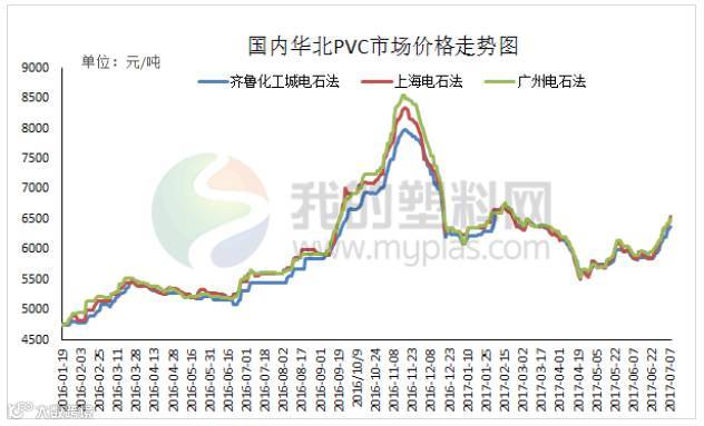 本周国内PVC市场成交尚可。周内V1709期货回调后突破上涨,加之现货市场货紧价高模式持续,市场涨幅明显。截至本周末,华北地区山东信发SG-5厂提6300元/吨,较上周五涨380元/吨;大沽800厂提价格在6300元/吨,较上周五涨250元/吨;杭州榆社SG-5送到6620元/吨,较上周五涨170元/吨;广州盐湖SG-5库提6450元/吨,较上周五涨350元/吨。