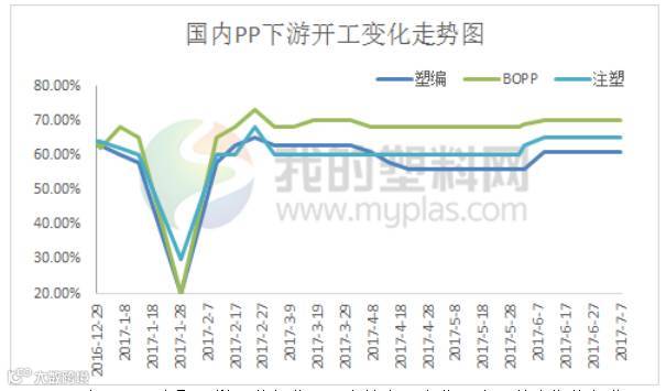 截止7月7日当周,国内聚丙烯下游行业开工率较上周变化不大。其中塑编行业开工率在61%左右,共聚行业开工率在65%,BOPP行业开工率在70%左右。