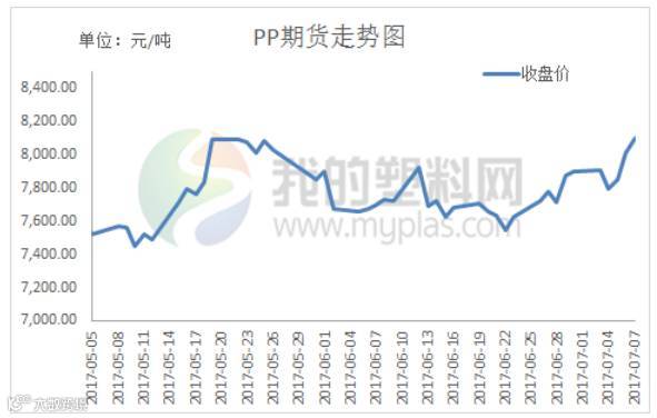 本周国内PP期货主力1709合约震荡走高。具体来看,周初开盘价在7910元/吨,周五收盘8098元/吨,最高8110元/吨,最低7778元/吨,周涨198元/吨或2.47%。成交量增加至43.58万手,持仓量增加至74.38万手。