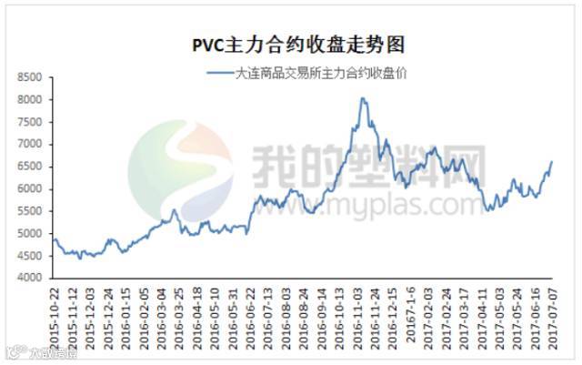 本周大商PVC主力合约1709跌后大涨。具体来看,周初开盘价在6410元/吨,周五收盘6610元/吨,最高6635元/吨,最低6275元/吨,周涨240元/吨或3.77%。成交量增加至122.5万手,持仓量增加至21.7万手。