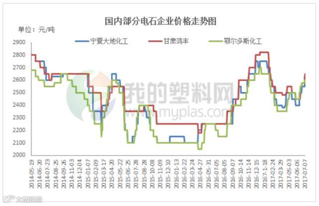 本周国内PVC市场交投活跃,报价上涨,涨幅在200元/吨上下。周初现货市场延续上周上涨态势,但V1709期货略显弱势,特别是周二出现小幅回调,现货市场有观望态势。周三开始,V1709期货大幅上涨,加之国内PVC企业库存偏低,部分企业预售后处于负库存状态,企业开始轮番上调,成本支撑下,现货市场开启“涨涨涨”模式。下游企业在初期积极询盘采购,加之市场货源紧缺,成交较好,临近周末,市场高价成交逐渐减少。截止到本周末国内电石法5型料主流报价在6280-6600元/吨;乙烯料主流市场价格在6500-6700元/吨,高型号价格高100-150元/吨。