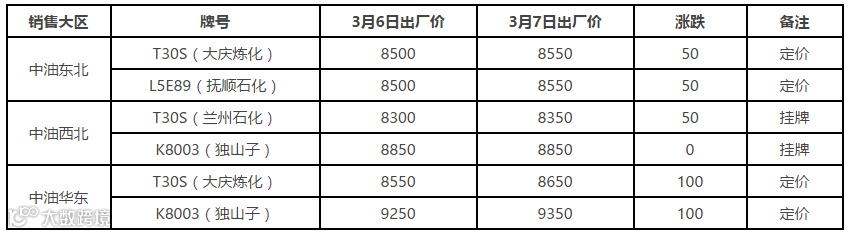 表5 3月7日国内PP出厂价格调整(单位:元/吨)