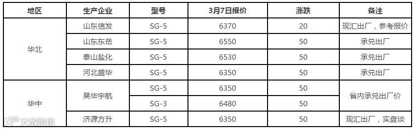 表6 3月7日国内PVC出厂价格调整(单位:元/吨)