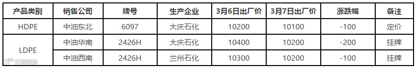 表4 3月7日国内PE出厂价格调整(单位:元/吨)