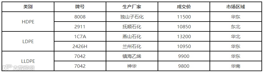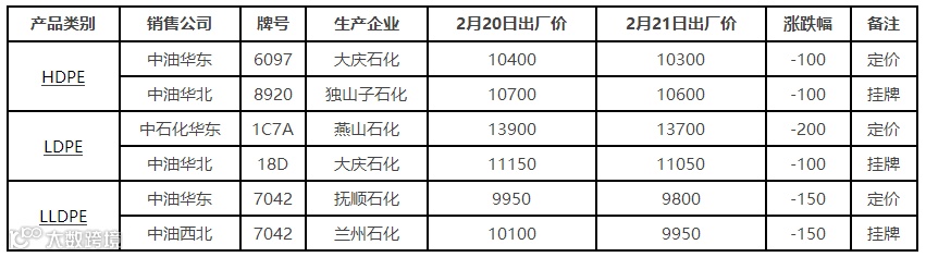 表4 2月21日国内PE出厂价格调整(单位:元/吨)