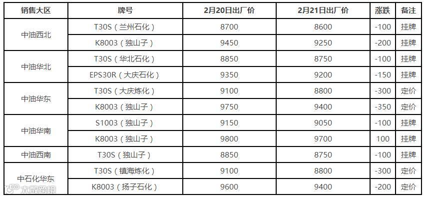 表5 2月21日国内PP出厂价格调整(单位:元/吨)