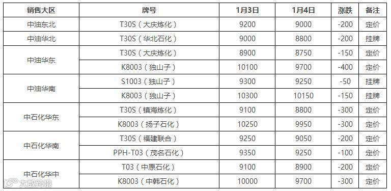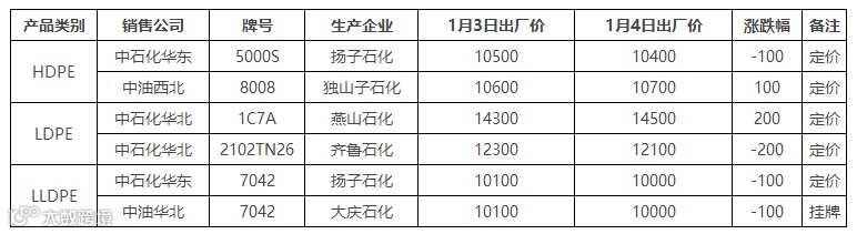 表4 1月4日国内PE出厂价格调整(单位:元/吨)
