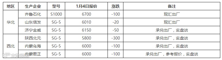 表6 1月4日国内PVC出厂价格调整(单位:元/吨)