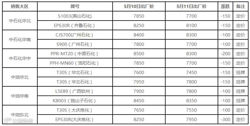 表5 5月11日国内PP出厂价格调整(单位:元/吨)