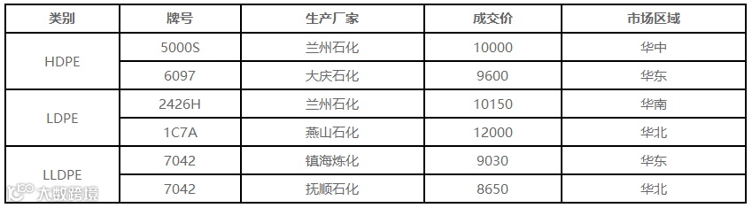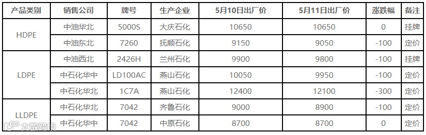 表4 5月11日国内PE出厂价格调整(单位:元/吨)