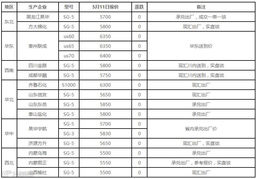 表6 5月11日国内PVC出厂价格调整(单位:元/吨)