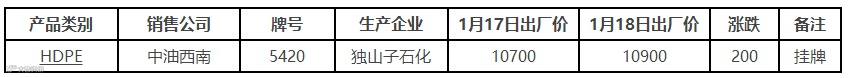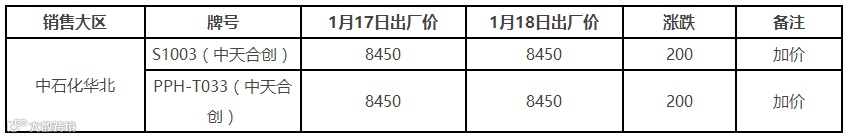 表4 1月18日国内PE出厂价格调整(单位:元/吨)
