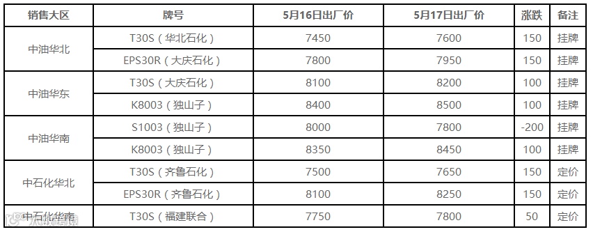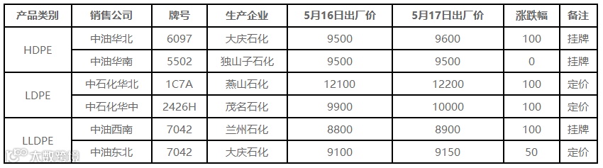 表4 5月17日国内PE出厂价格调整(单位:元/吨)